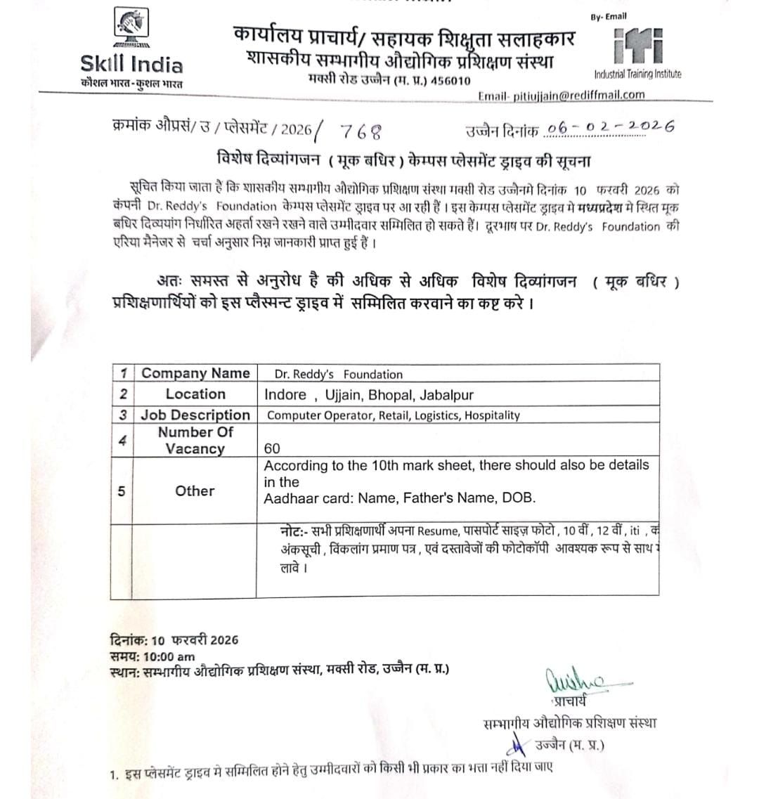 विशेष दिव्यांगजन (मुक बधिर) कैंपस प्लेसमेंट ड्राइव की सूचना: सभी को सूचित किया जाता है कि शासकीय संभागीय औद्योगिक प्रशिक्षण संस्था मक्सी रोड उज्जैन में दिनांक 10 फरवरी 2026 को कंपनी Dr. Reddy’s foundation Campus Placement ड्राइव पर आ रही है इस कैंपस प्लेसमेंट ड्राइव में मध्य प्रदेश में स्थित मूकबधिर दिव्यांग निर्धारित अहर्ता रखने वाले उम्मीदवार सम्मिलित हो सकते हैं। इस भर्ती से संबंधित जानकारी निम्न प्रकार हैं: