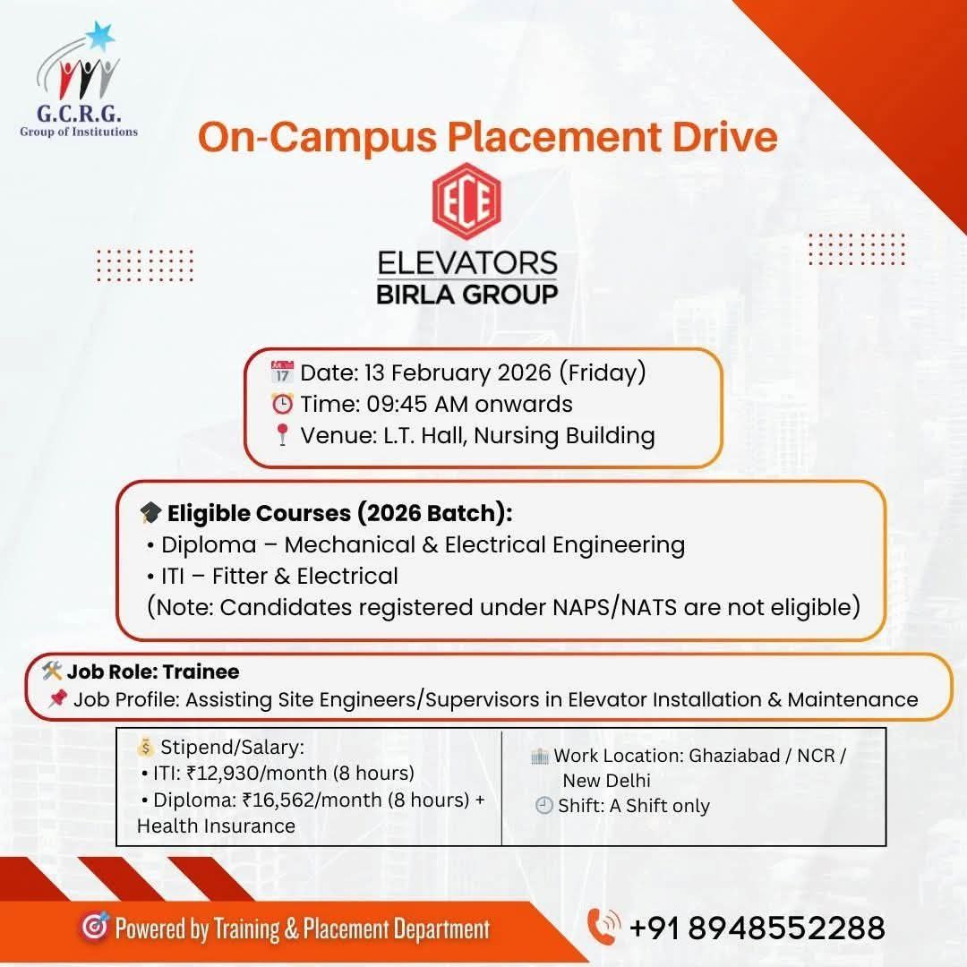 ELEVATORS Birla Group Recruitment 2026: We are delighted to announce an On-Campus Placement Drive by Birla Group (Birla Elevators) at G.C.R.G. Memorial Trust’s Group of Institutions, Lucknow. This is a valuable opportunity for Diploma and ITI students of the 2026 batch to begin their professional journey with one of India’s most trusted and reputed industrial groups.