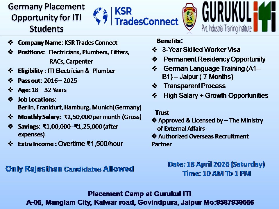 Gurukul ITI Jaipur Campus Placement 2026 | KSR Trades Connect German | ITI Pass Job in Germany