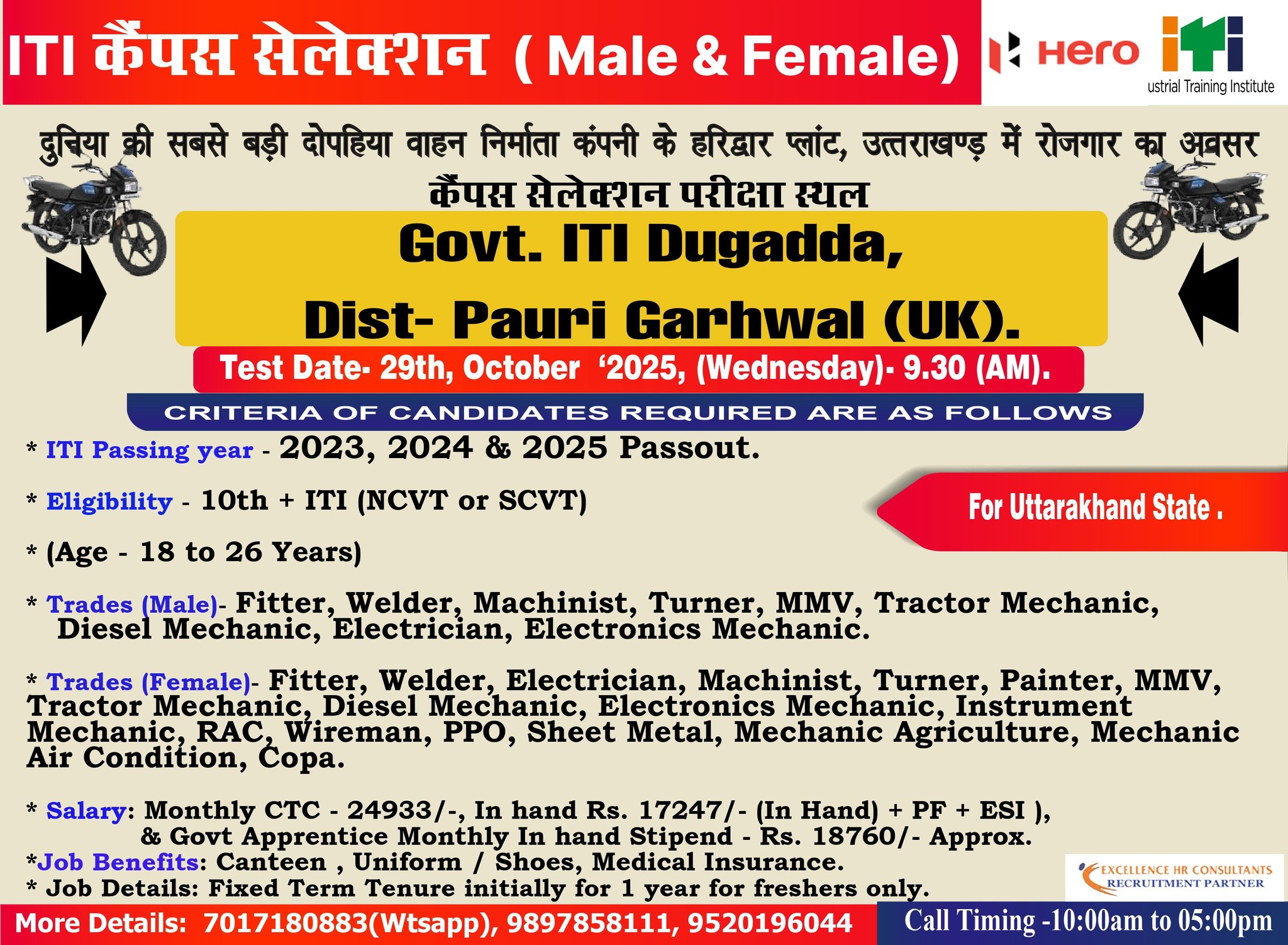 Hero MotoCorp Haridwar Vacancy 2025: All 10th as well as ITI passed Male & Female candidates are informed that the world’s largest two-wheeler manufacturer Hero MotoCorp Company is offering an opportunity to get employment in its “Haridwar Plant”, Uttarakhand. To avail this opportunity, all interested candidates have to appear at the below mentioned institute with all their required documents. For more details, read the post till the end. To get continuous job updates, visit pvtjob.in daily and always stay two steps ahead.