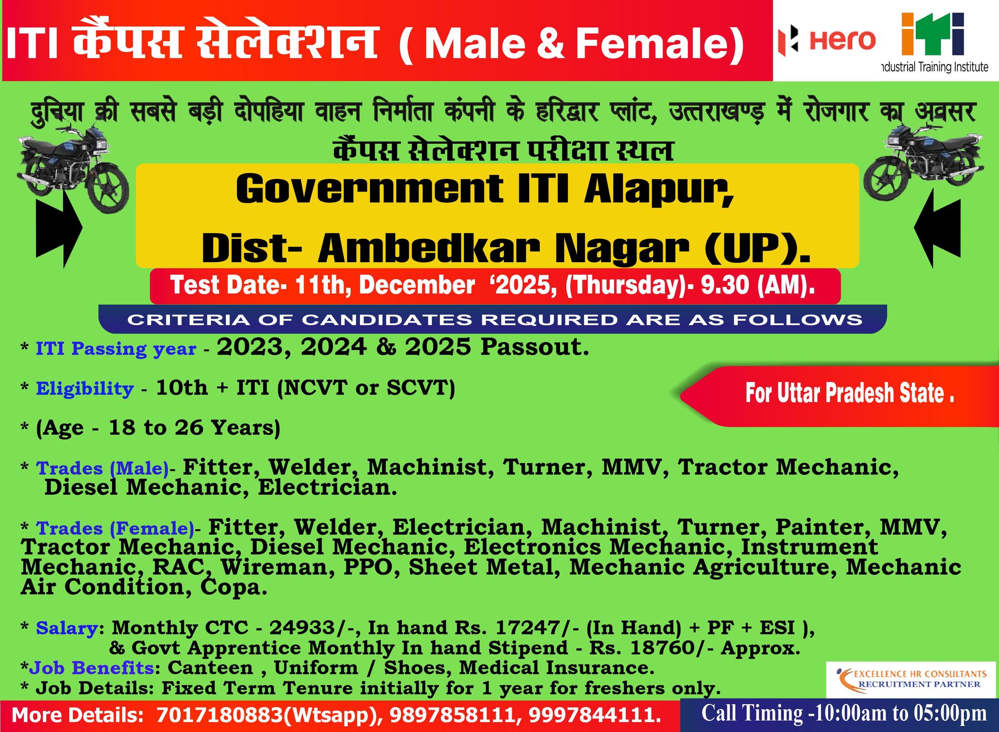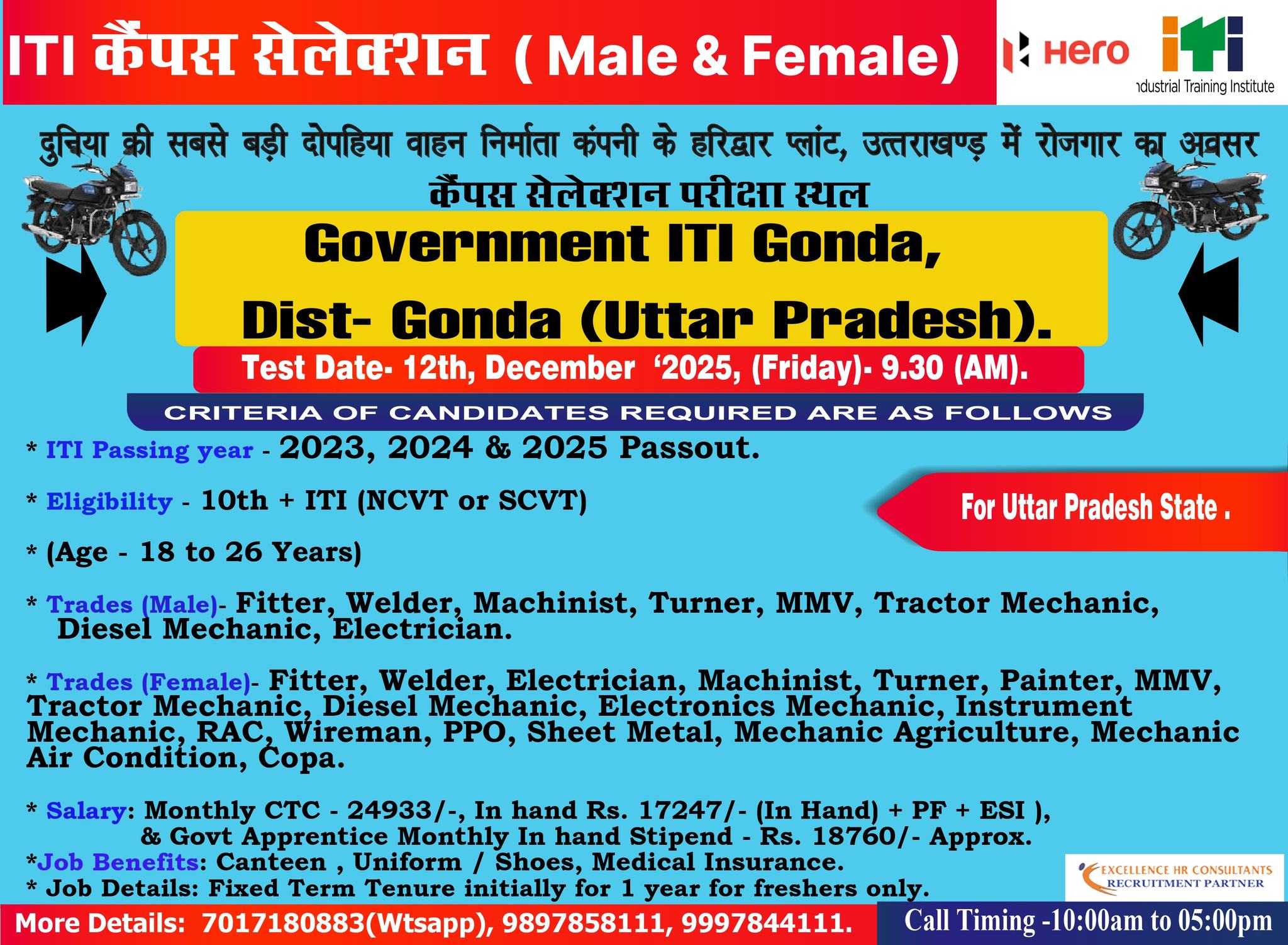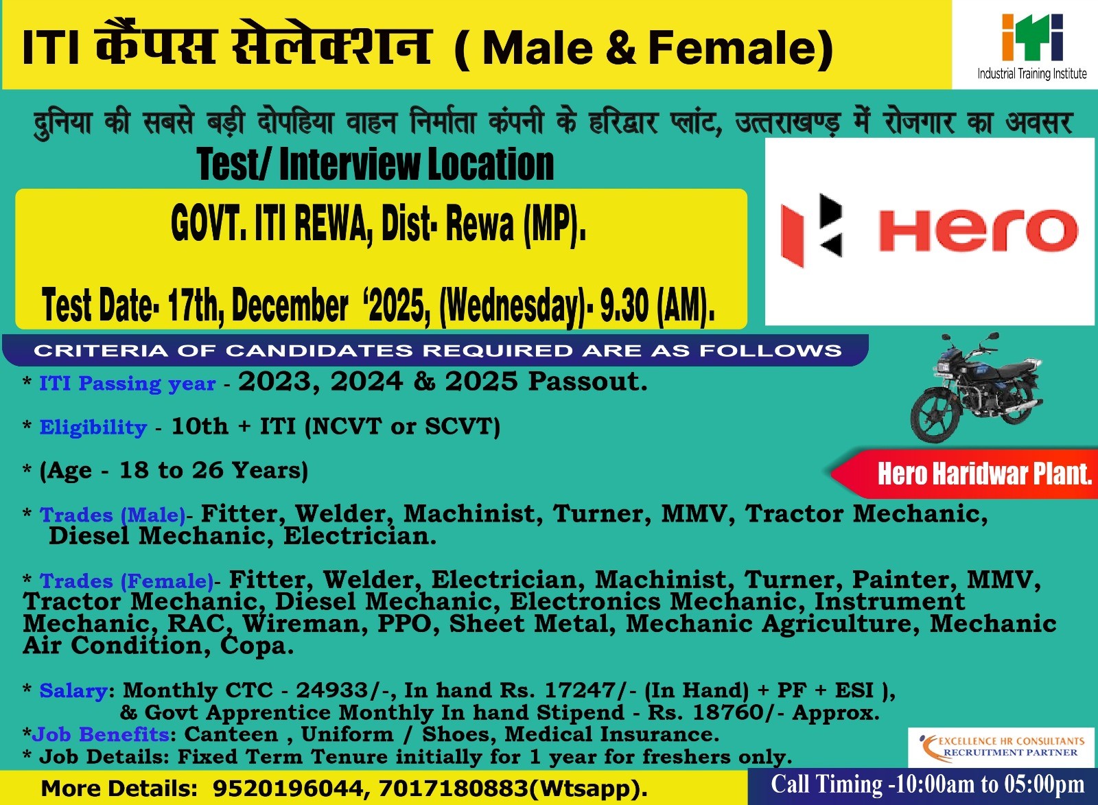 Hero MotoCorp Haridwar Vacancy 2025: All 10th as well as ITI passed Male & Female candidates are informed that the world’s largest two-wheeler manufacturer Hero MotoCorp Company is offering an opportunity to get employment in its “Haridwar Plant“, Uttarakhand. To avail this opportunity, all interested candidates have to appear at the below mentioned institute with all their required documents. For more details, read the post till the end. To get continuous job updates, visit pvtjob.in daily and always stay two steps ahead.