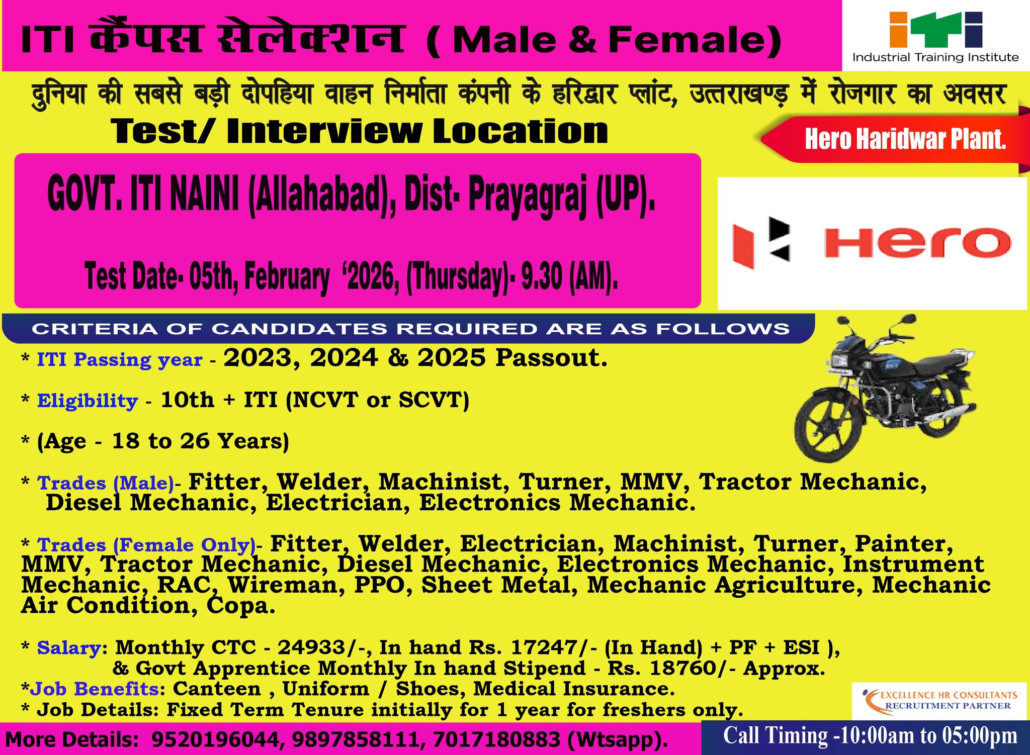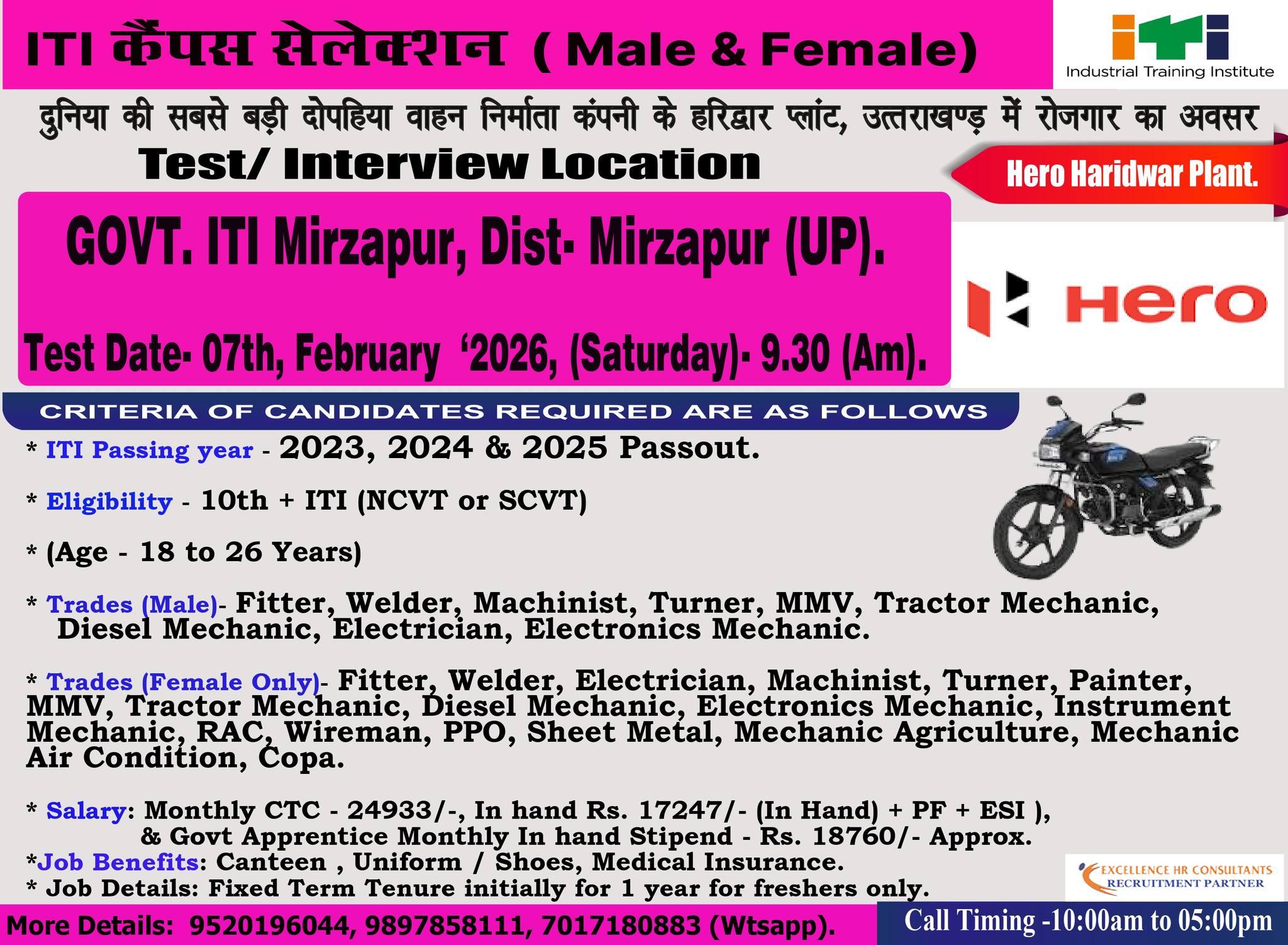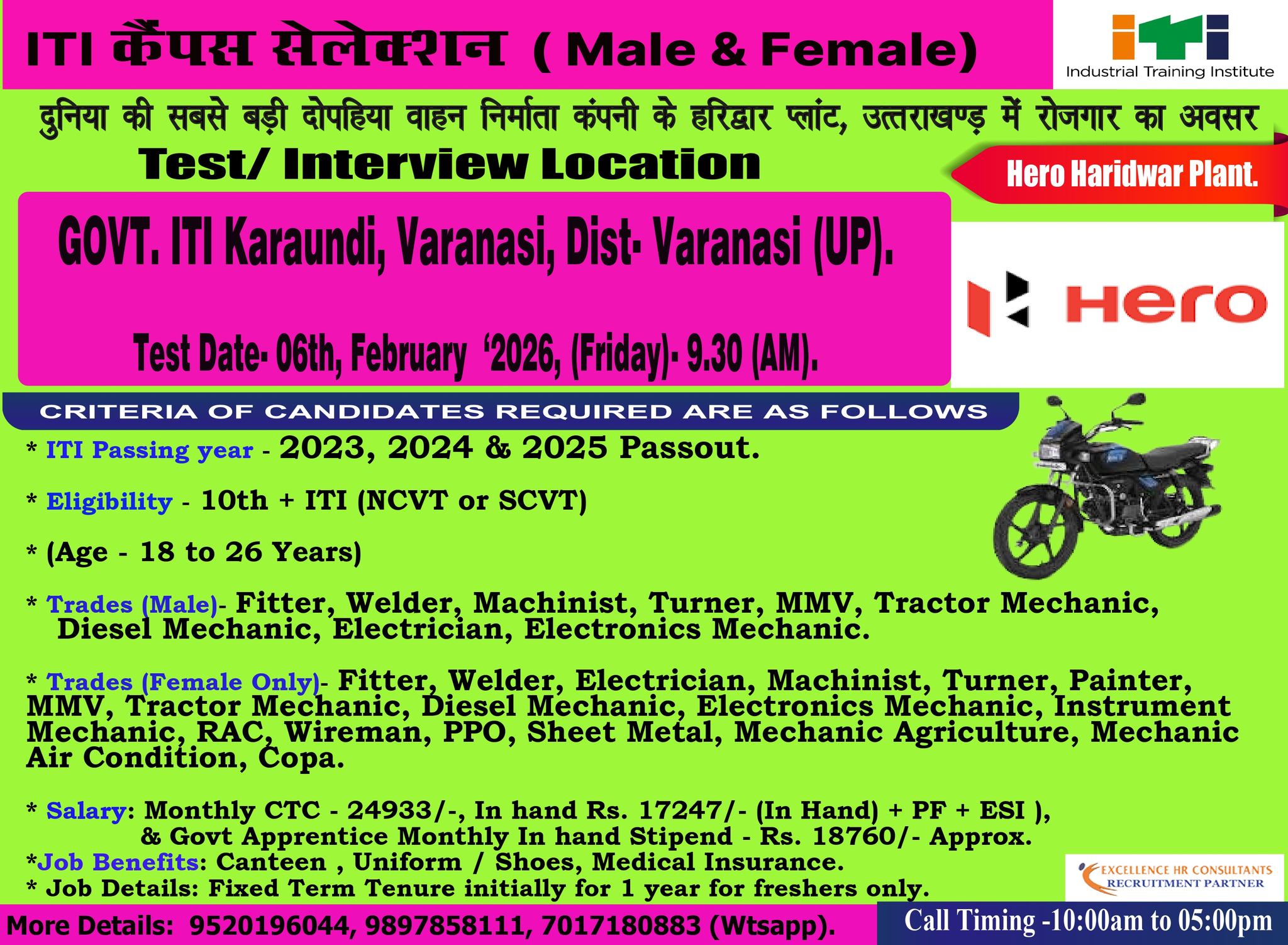 Hero MotoCorp Haridwar Vacancy 2026: All 10th as well as ITI passed Male & Female candidates are informed that the world’s largest two-wheeler manufacturer Hero MotoCorp Company is offering an opportunity to get employment in its “Haridwar Plant“, Uttarakhand. To avail this opportunity, all interested candidates have to appear at the below mentioned institute with all their required documents. For more details, read the post till the end. To get continuous job updates, visit pvtjob.in daily and always stay two steps ahead.