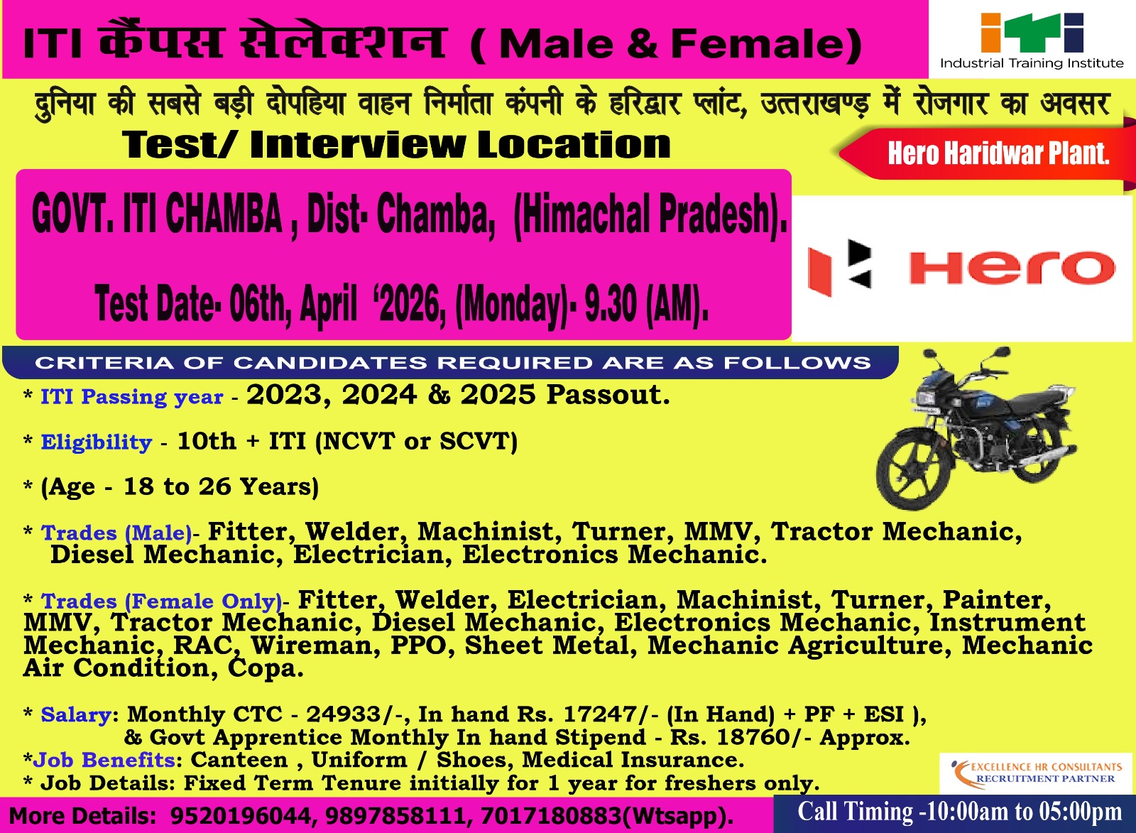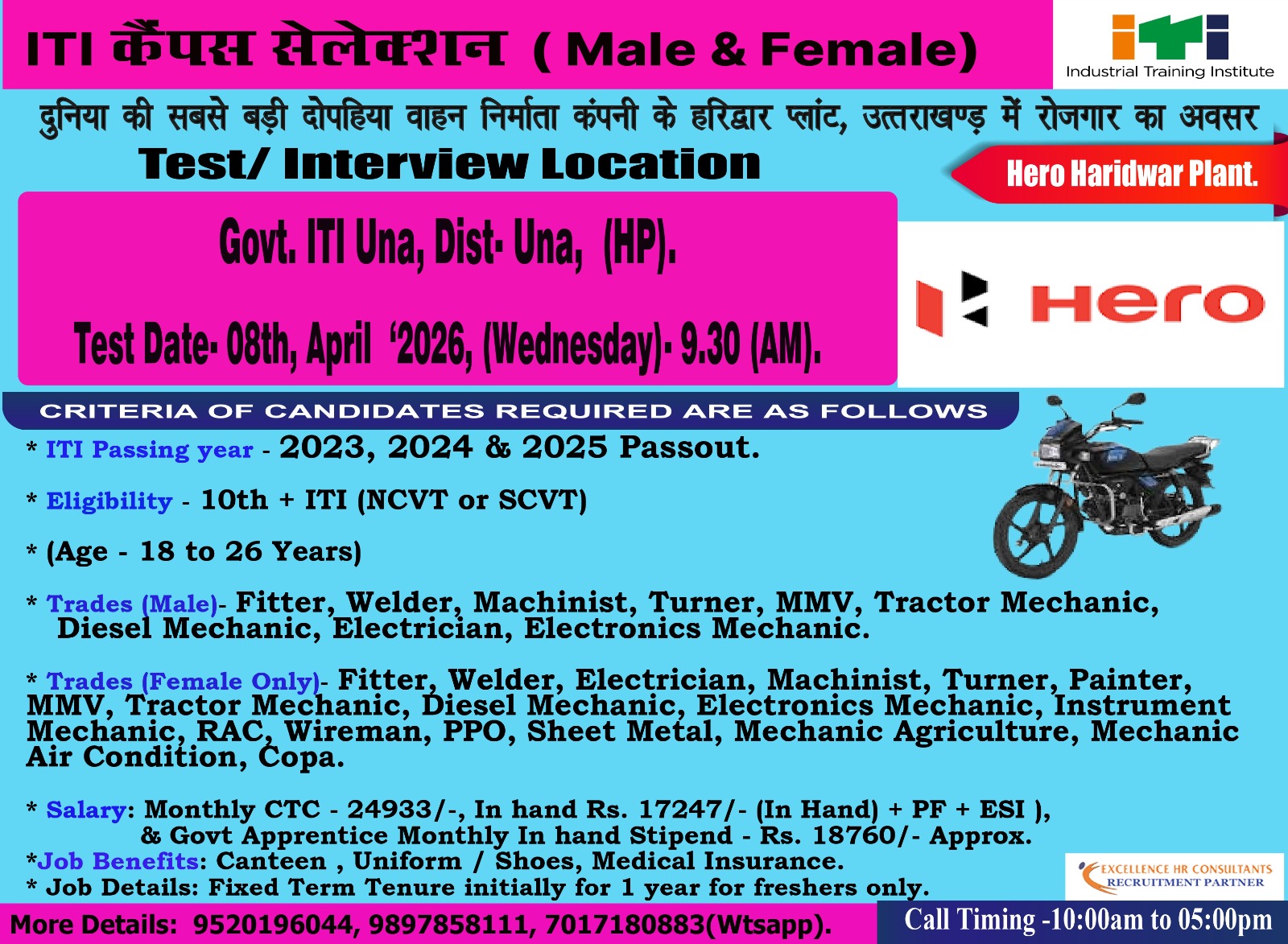 Hero MotoCorp Haridwar Vacancy 2026: All 10th as well as ITI passed Male & Female candidates are informed that the world’s largest two-wheeler manufacturer Hero MotoCorp Company is offering an opportunity to get employment in its “Haridwar Plant“, Uttarakhand. To avail this opportunity, all interested candidates have to appear at the below mentioned institute with all their required documents. For more details, read the post till the end. To get continuous job updates, visit pvtjob.in daily and always stay two steps ahead.