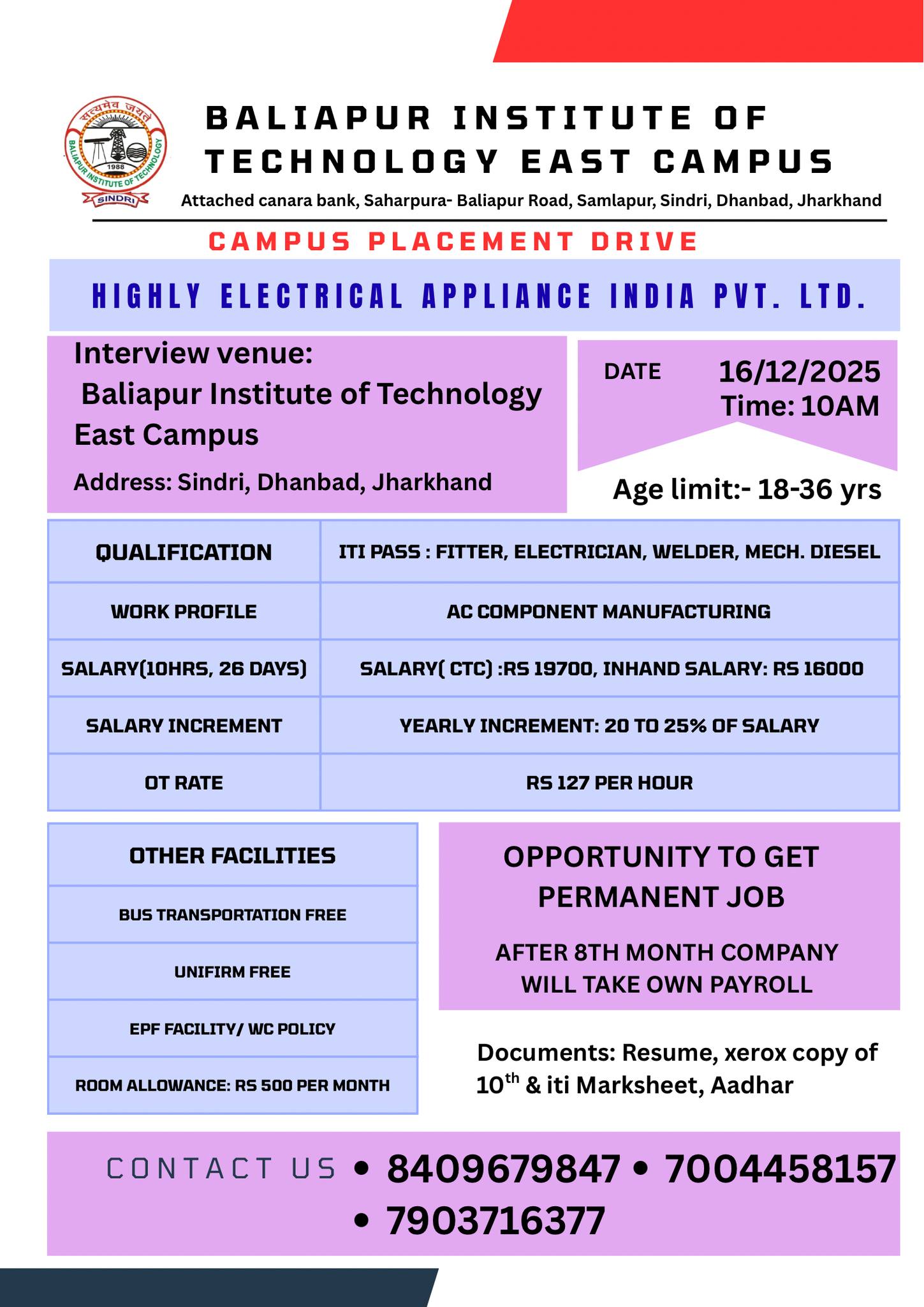 Highly Electrical Appliance India Recruitment 2025: सभी ITI Pass युवाओं को सूचित किया जाता है कि Highly Electrical Appliance India Pvt. Ltd. में भर्ती के लिए 16 December 2025 को कैंपस प्लेसमेंट का आयोजन किया जा रहा है। यह कैंपस ड्राइव Baliapur Institute of Technology East Campus, Attached Canara bank, Saharpura – Baliapur Road, Samlapur, Sindri, Dhanbad, Jharkhand में आयोजित किया जाएगा। इसलिए, सभी इच्छुक युवा अपने सभी ज़रूरी डॉक्यूमेंट्स के साथ इंस्टीट्यूट में आ सकते हैं।