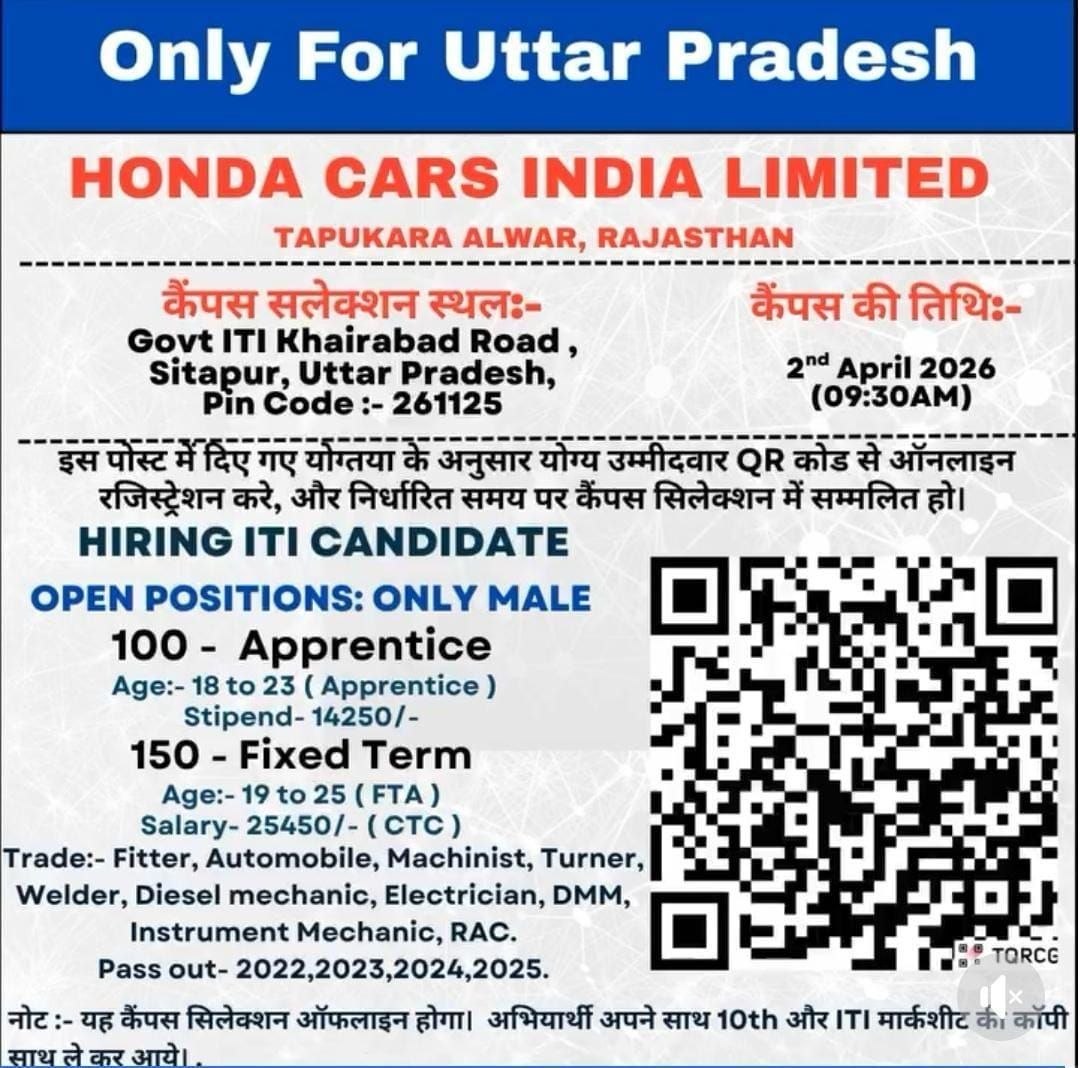 Honda Cars Recruitment 2026: A golden opportunity has come for the youth who are dreaming of getting a job in Honda Car Limited. All ITI passed youth are informed to take advantage of this opportunity by appearing at Govt ITI Khairabad Road, Sitapur, Uttar Pradesh on 02 April 2026. This campus drive will be organized for all ITI passed youth. This campus is being organized by Honda Vocational Training Center. For more information, please see the information given below. Do not forget to join our WhatsApp channel to get continuous information related to jobs.