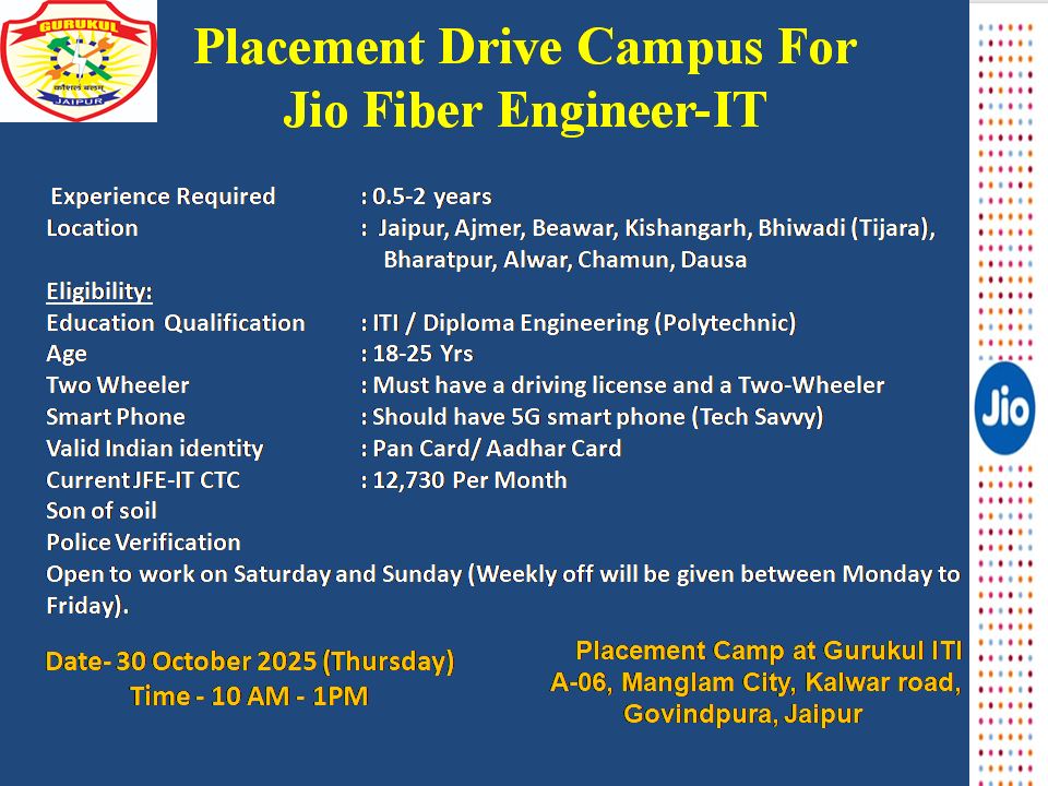 Jaipur City Campus Placement 2025: A placement camp for Jio Fiber Engineer-IT is being held on Thursday, October 30, 2025, at 10:00 AM at Gurukul Industrial Training Institute, Mangalam City, Kalwad Road, Jaipur. All ITI and diploma Pass are eligible to participate in this campus drive. To participate, please fill out and submit the form from the link below.