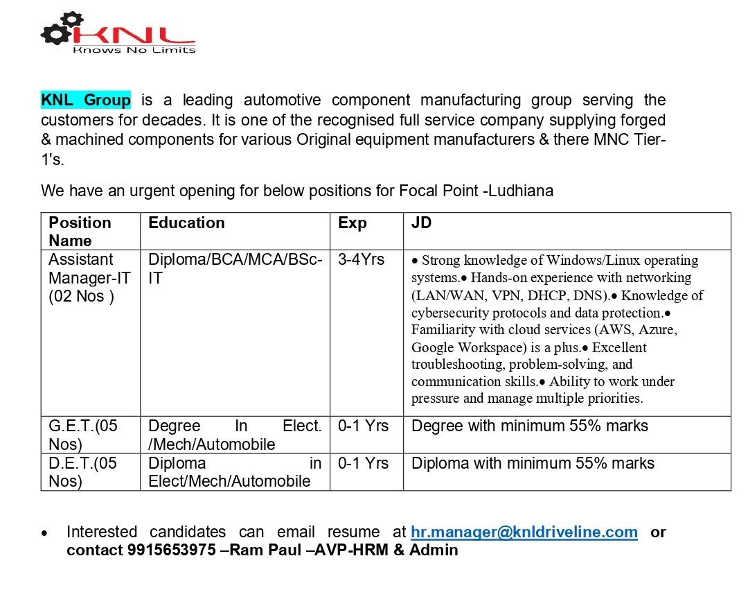 KNL Group Vacancy 2025 | Diploma / BCA/MCA/BSc-IT