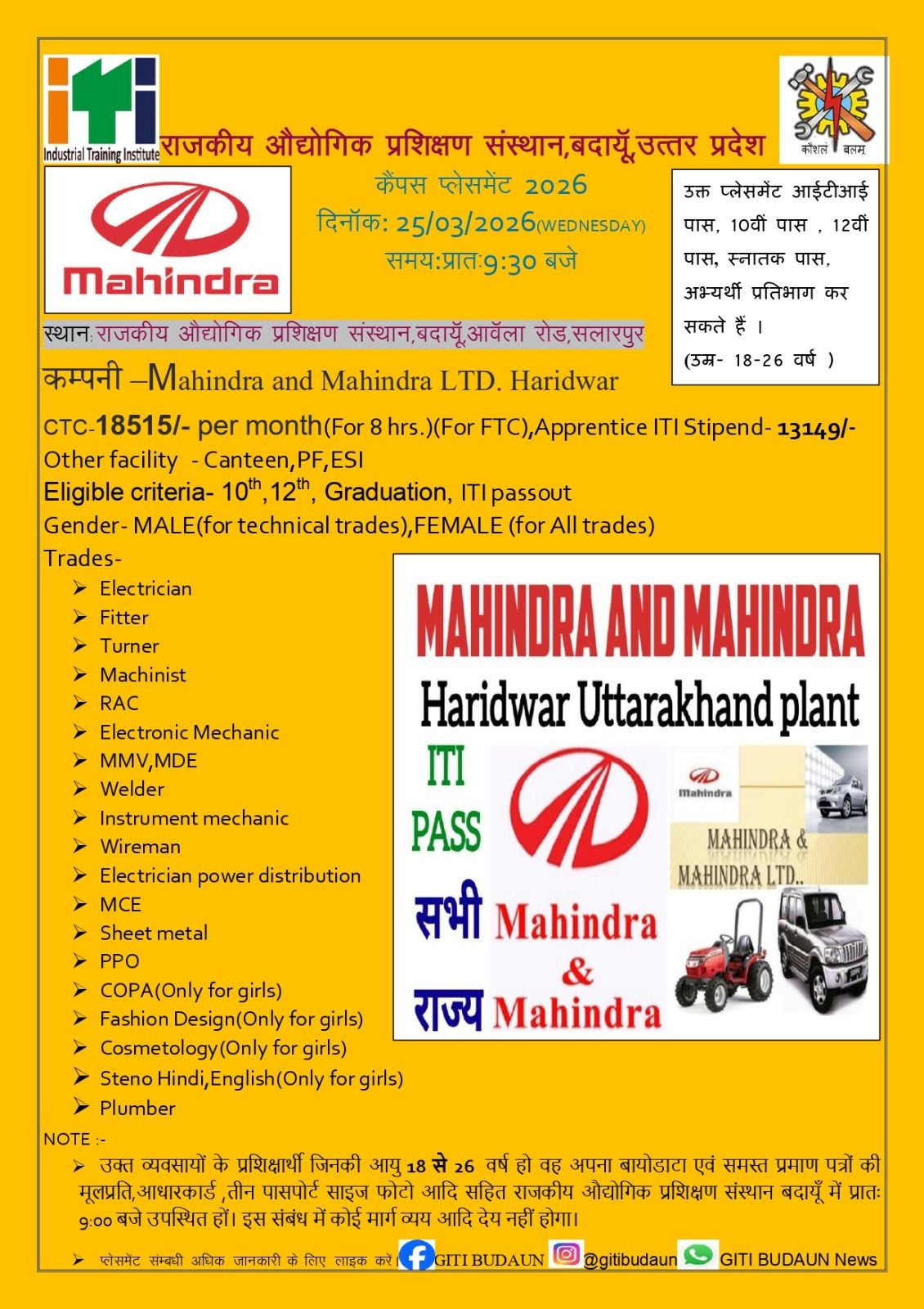 Mahindra & Mahindra Recruitment 2026: सभी 10th, 12th, ITI and Graduation Pass युवाओं को सूचित किया जाता है कि महिंद्रा एंड महिंद्रा लिमिटेड प्लांट, हरिद्वार, उत्तराखंड में भर्ती के लिए 25 March 2026 को कैंपस प्लेसमेंट का आयोजन किया जा रहा है। यह Campus Placement Camp राजकीय औद्योगिक प्रशिक्षण संस्थान, बदायूं, उत्तर प्रदेश में आयोजित किया जाएगा। इसलिए, सभी इच्छुक युवा अपने सभी ज़रूरी डॉक्यूमेंट्स के साथ इंस्टीट्यूट में आ सकते हैं। ज़्यादा जानकारी के लिए नीचे दिया विज्ञापन देखें। पोस्ट को अपने दोस्तों के साथ शेयर जरूर करें।