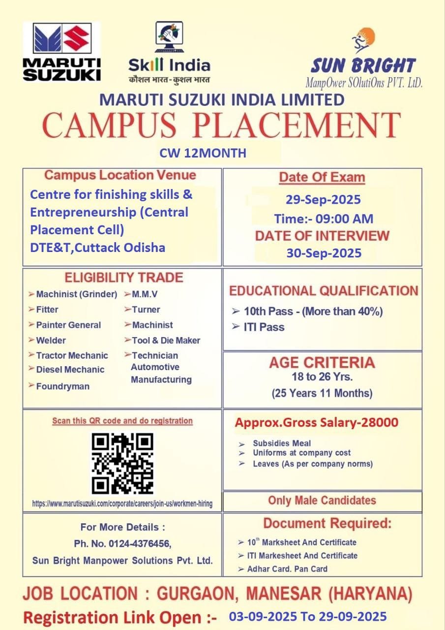 Maruti Suzuki CW Recruitment 2025: All ITI pass youth are informed that applications have been invited from ITI pass candidates for appointment to the post of Contractual Workmen (CW) in India’s leading passenger vehicle manufacturer Maruti Suzuki India Limited Gurgaon / Manesar. In this recruitment, about 500 CW posts are to be recruited. Therefore, all the interested ITI pass youth who want to work under CW in Maruti Suzuki India Limited, should fill and submit the registration form given below.