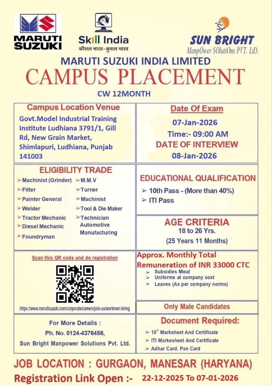 Maruti Suzuki CW Recruitment 2026: All ITI pass youth are informed that applications have been invited from ITI pass candidates for appointment to the post of Contractual Workmen (CW) in India’s leading passenger vehicle manufacturer Maruti Suzuki India Limited Gurgaon / Manesar. In this recruitment, about 500 CW posts are to be recruited. Therefore, all the interested ITI pass youth who want to work under CW in Maruti Suzuki India Limited, should fill and submit the registration form given below.