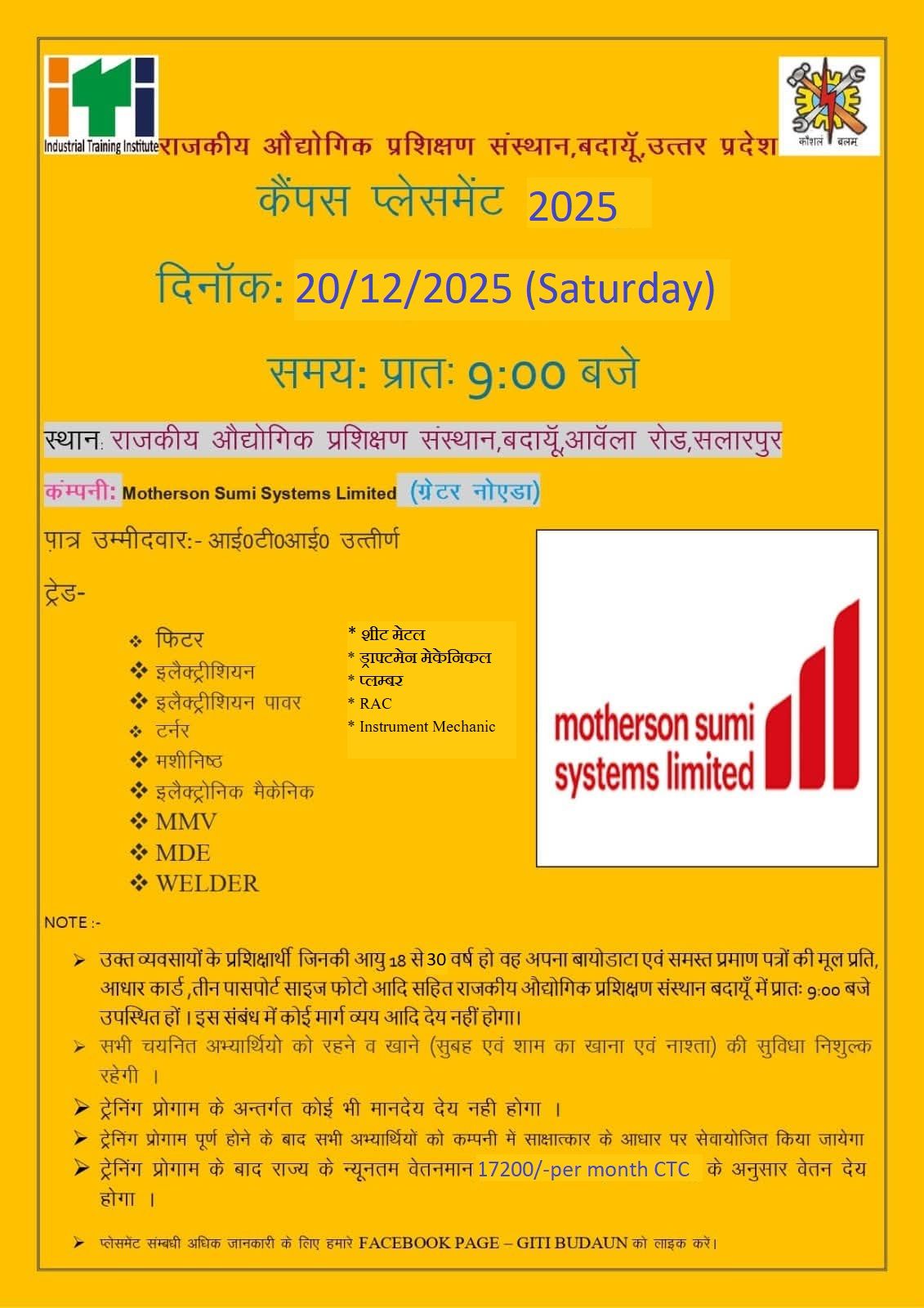 Venue: राजकीय औद्योगिक प्रशिक्षण संस्थान, बदायूं, आँवला रोड, सलारपुर।