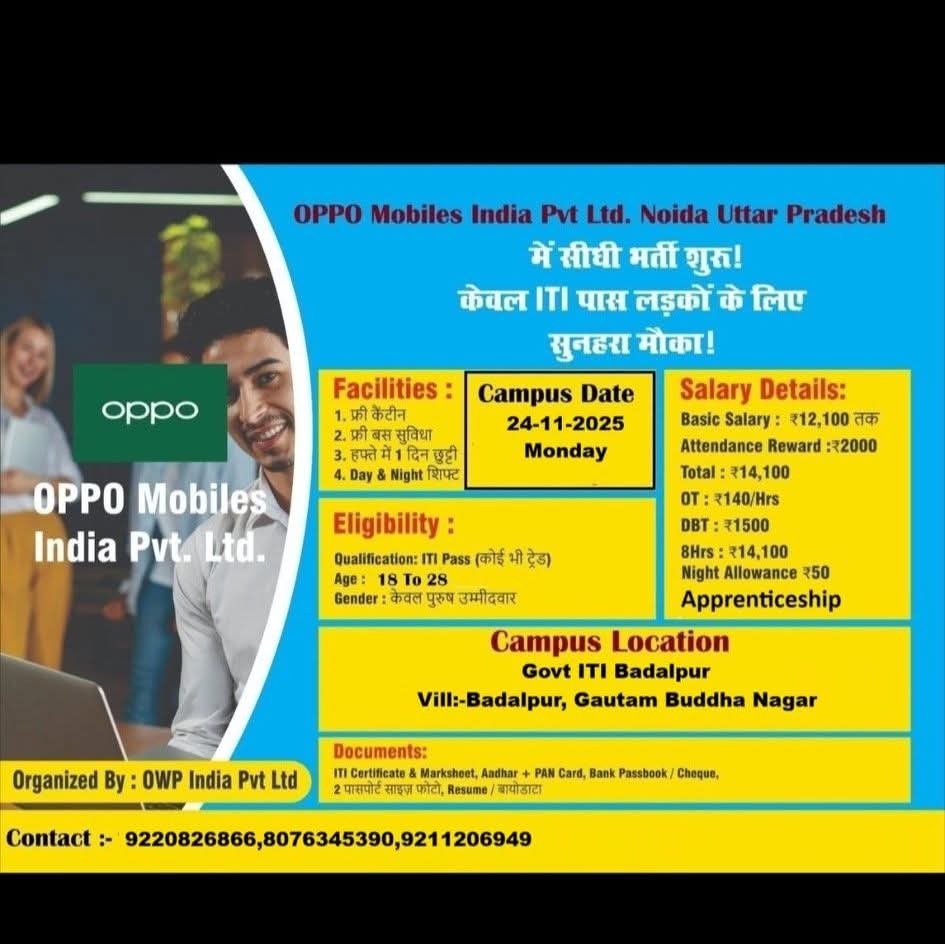 OPPO Mobiles India Limited Recruitment 2025: OPPO Mobiles India Pvt Ltd. Noida Uttar Pradesh has issued an advertisement for campus placement in Govt ITI Badalpur, Vill- Badalpur, Gautam Buddha Nagar, UP. for direct recruitment. Here a golden opportunity has been given only to ITI passed boys. Therefore, all ITI passed male candidates must appear in the institute with all their necessary documents.