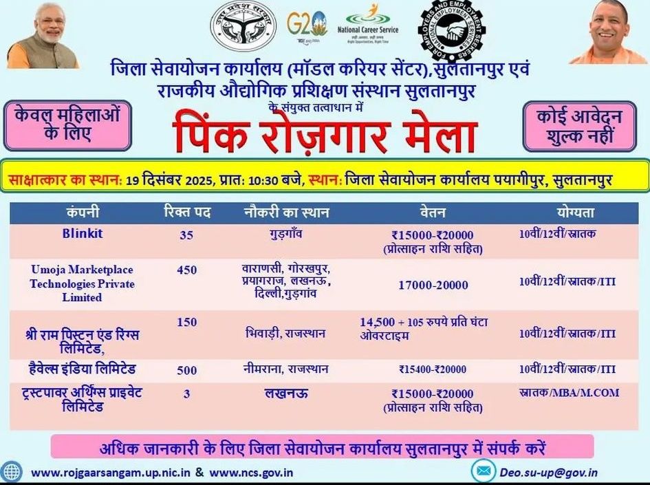 Pink Rojgar Mela 2025: जिला सेवायोजन कार्यालय (मॉडल करियर सेंटर), सुलतानपुर एवं राजकीय औद्योगिक प्रशिक्षण संस्थान सुलतानपुर मे दिनांक 19 दिसम्बर 2025 के दिन सुबह 10 बजे से पिंक रोज़गार मेला का आयोजन किया जा रहा है। यह रोजगार मेला केवल महिला अभ्यार्थीयो के लिए आयोजित किया जा रहा है। अतः सभी इच्छुक अभ्यार्थी अपने सभी जरूरी दस्तावेजों के साथ दिए गए संस्थान पते पर उपस्थित होकर इस अवसर का लाभ ले सकती है।