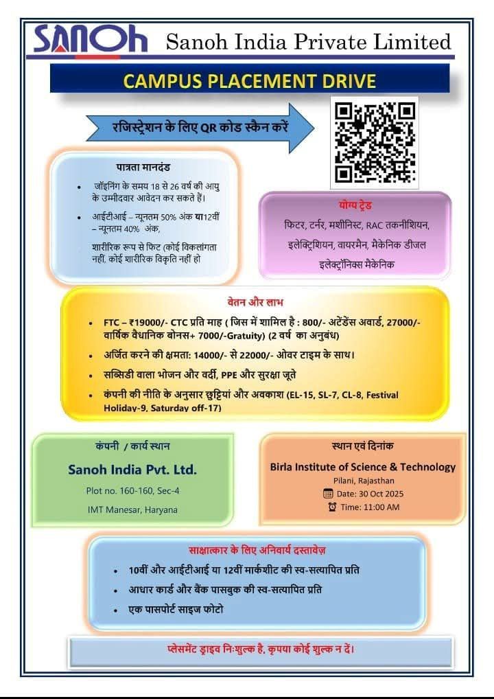 Sanoh India Private Limited Jobs 2025: All ITI pass candidates are informed that a campus drive is being organized at Birla Institute of Science and Technology, Pilani, Rajasthan on 30 October 2025. All ITI pass candidates can participate in this campus drive. See the post till the end for full details.