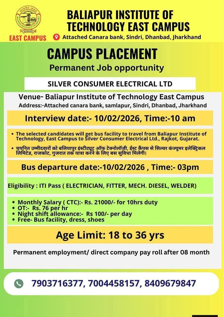 Note: The Selected Candidates will get bus facility to travel from baliapur institute of technology, East Campus to Silver Consumer Electrical Ltd. Rajkot, Gujarat.