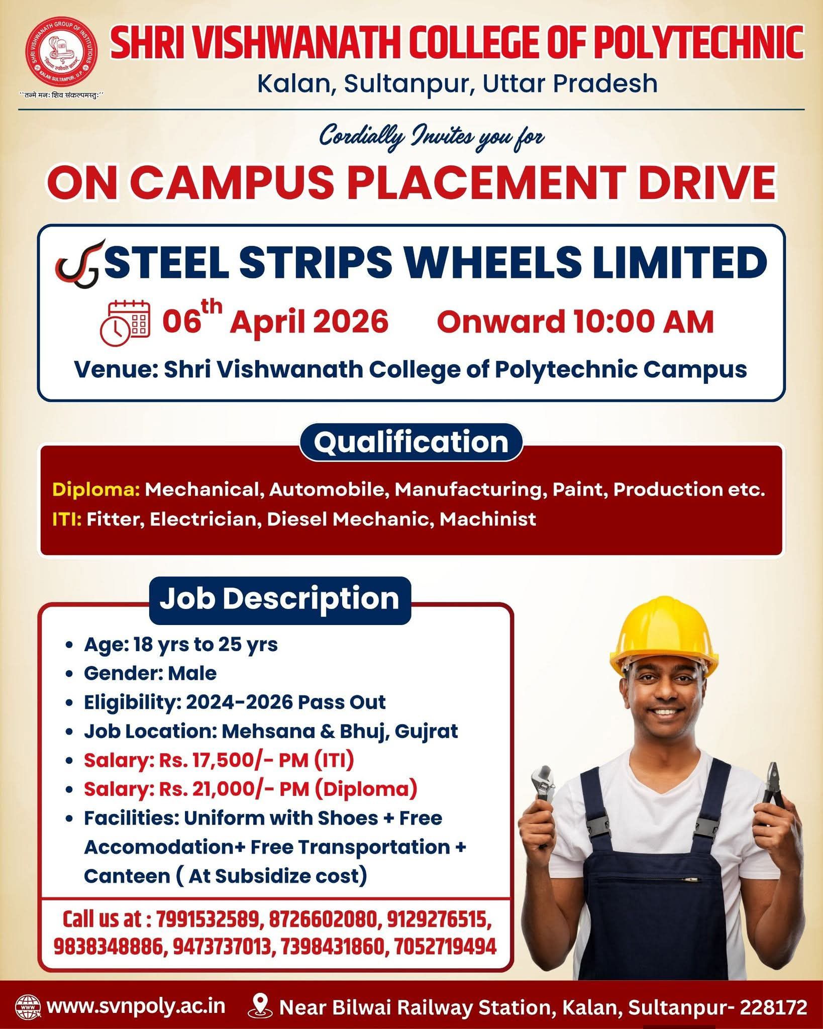 Steel Strips Wheels Recruitment 2026: A campus placement drive for recruitment at Steel Strips Wheels Limited will be held on 06 April 2026. All ITI and Diploma-holding candidates aged between 18 to 25 years are eligible to participate in this campus drive. The venue for this drive has been designated as the Shri Vishwanath College of Polytechnic Campus, located near Bilwai Railway Station, Kalan, Sultanpur, UP. For further details, please read this post until the end.