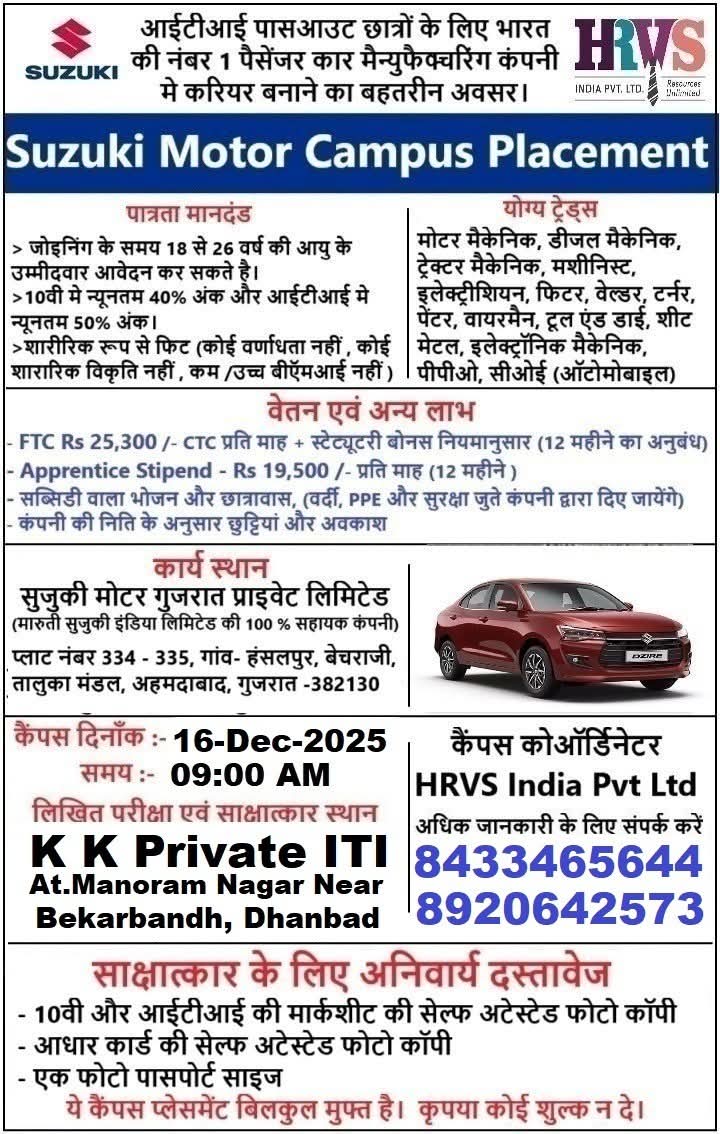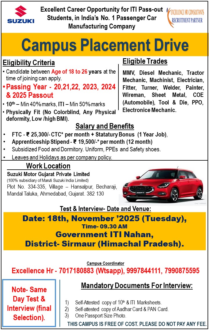 Suzuki Motors Campus Placement 2025: This is a golden opportunity for all ITI pass youth to get a job in Suzuki Motor Gujarat. ITI Campus Placement is being organized on 16 December 2025 for recruitment in Suzuki Motor Gujarat. Information related to this campus drive is being given below. Therefore, all the interested youth who want to get a job should appear at the given campus venue with all the necessary documents. You can get more information regarding the job here.