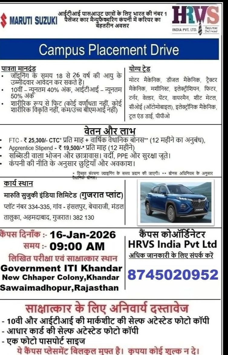 Suzuki Motors Campus Placement 2026: This is a golden opportunity for all ITI pass youth to get a job in Suzuki Motor Gujarat. ITI Campus Placement is being organized on 16 January 2026 for recruitment in Suzuki Motor Gujarat. Information related to this campus drive is being given below. Therefore, all the interested youth who want to get a job should appear at the given campus venue with all the necessary documents. You can get more information regarding the job here.
