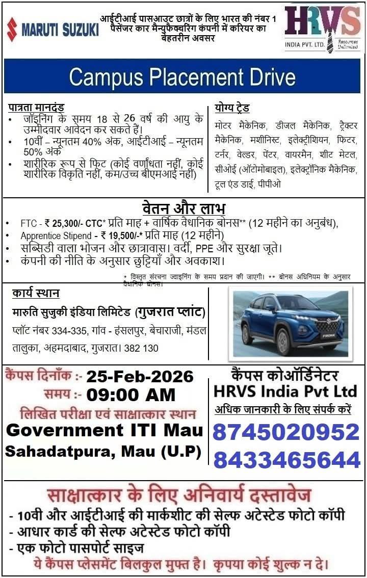 Suzuki Motors Campus Placement 2026: This is a golden opportunity for all ITI pass youth to get a job in Suzuki Motor Gujarat. ITI Campus Placement is being organized on 25 February 2026 for recruitment in Suzuki Motor Gujarat. Information related to this campus drive is being given below. Therefore, all the interested youth who want to get a job should appear at the given campus venue with all the necessary documents. You can get more information regarding the job here.