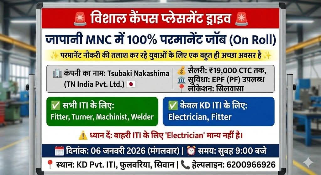 TN India Limited Vacancy Details 2026: KD Pvt ITI, Phulwaria, Siwan, Bihar is organizing an ITI campus placement drive for ITI pass-out students. This campus drive is being conducted for recruitment at TN (Tsubaki Nakashima) India Pvt. Ltd. All eligible candidates can participate in this campus drive by visiting the institute with their necessary documents.