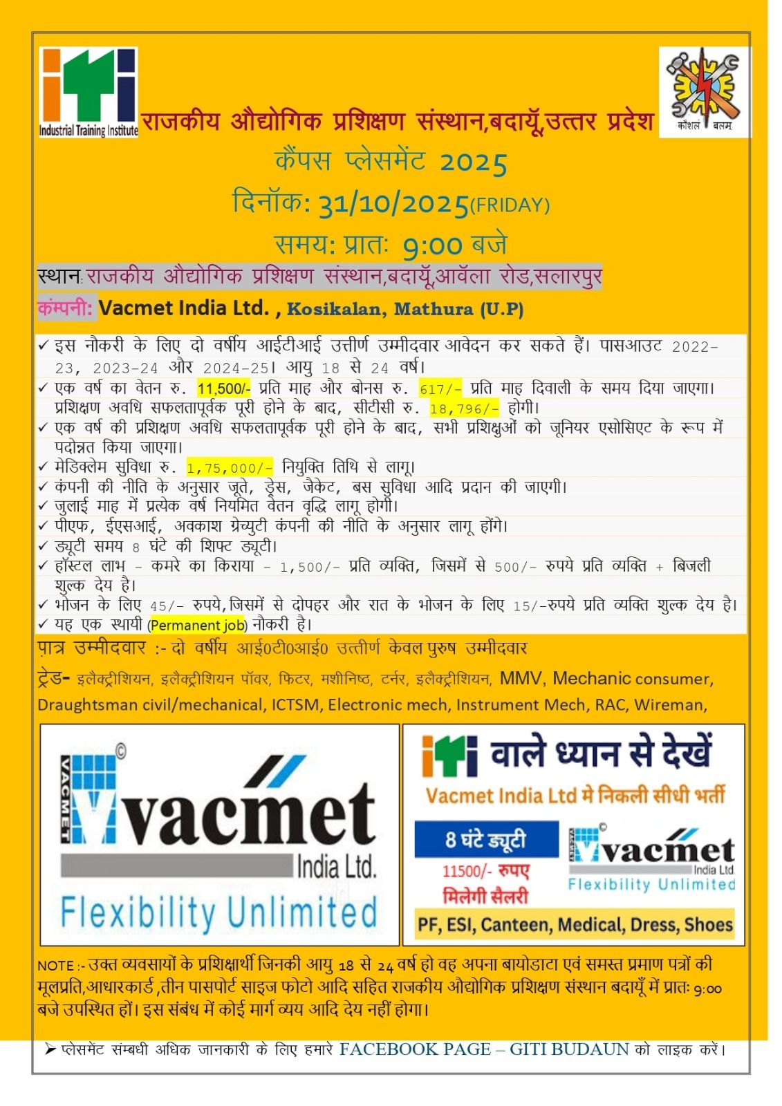 Vacmet India Ltd Recruitment 2025: All ITI pass outs are informed that a one-day campus drive is being organized at Government Industrial Training Institute, Budaun, Uttar Pradesh from 9 am on 31st October 2025. Therefore, all ITI pass outs who wish to participate in this campus drive can be present at the institute at the given time.
